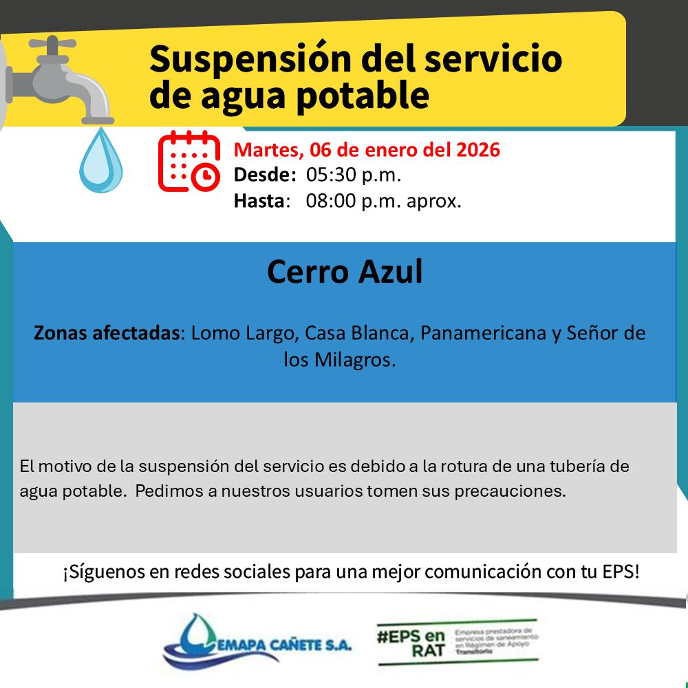 SUSPENSIÓN TEMPORAL DEL SERVICIO DE AGUA POTABLE EN CERRO AZUL