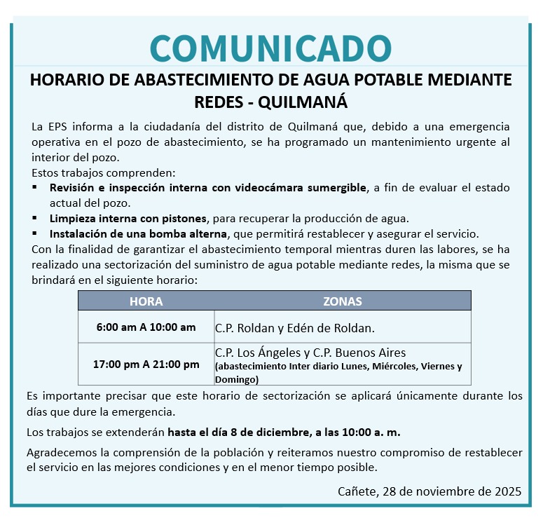 Emapa Cañete S.A. informa a sus usuarios de Quilmaná sobre el mantenimiento urgente en el Pozo N° 01, debido a problemas eléctricos en la bomba sumergible.
