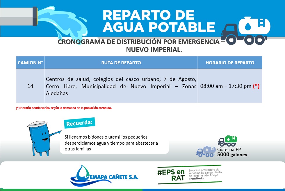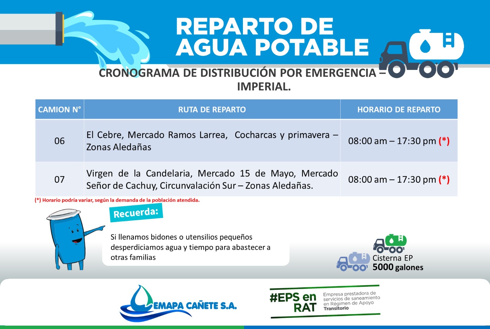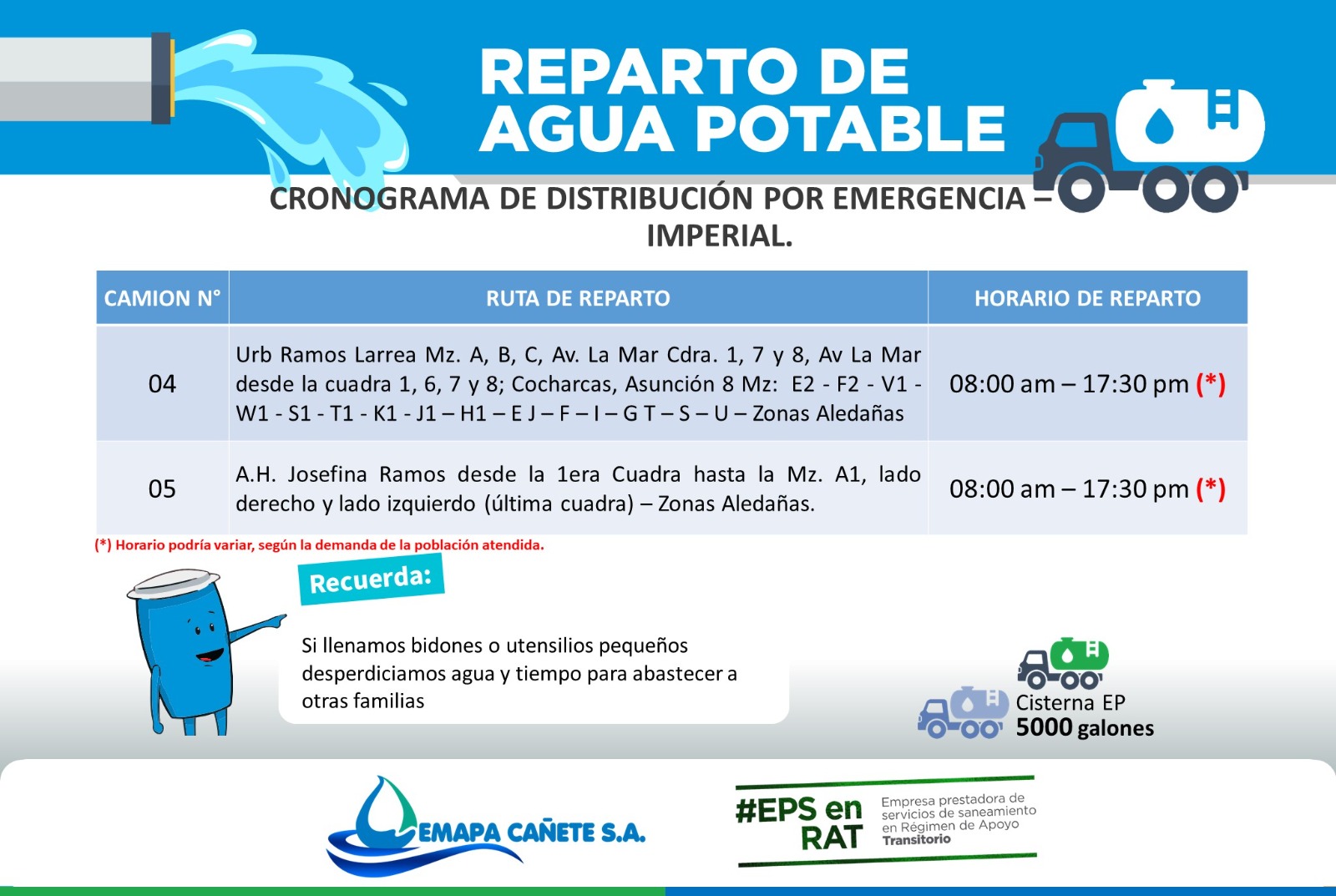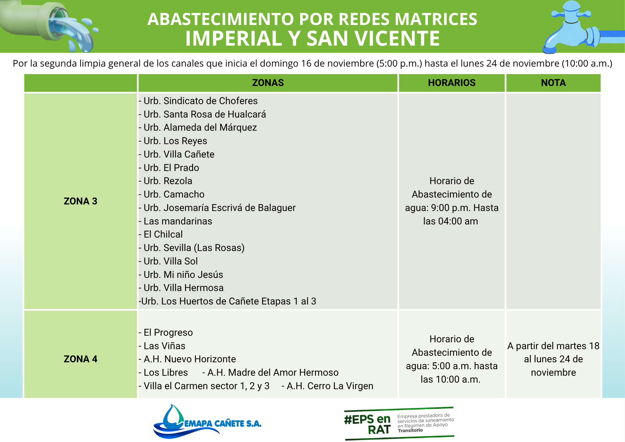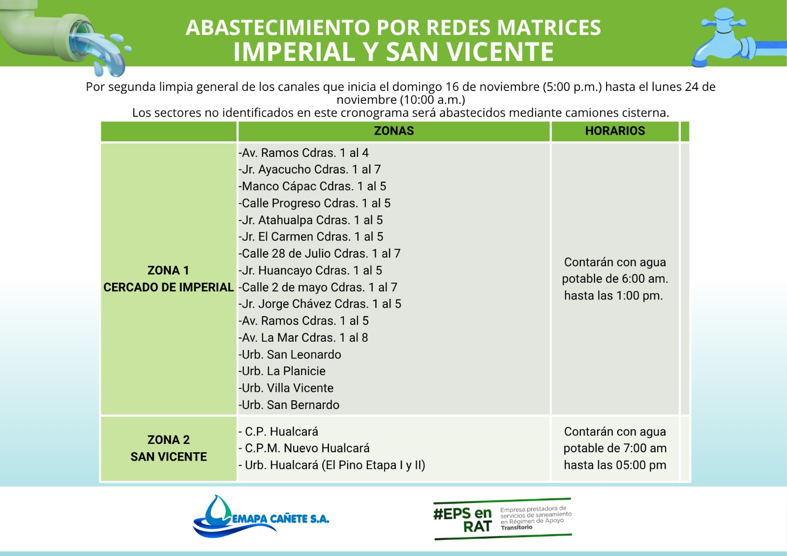 Estimados vecinos de Imperial, San Vicente y Nuevo Imperial, Emapa Cañete S.A. informa:
