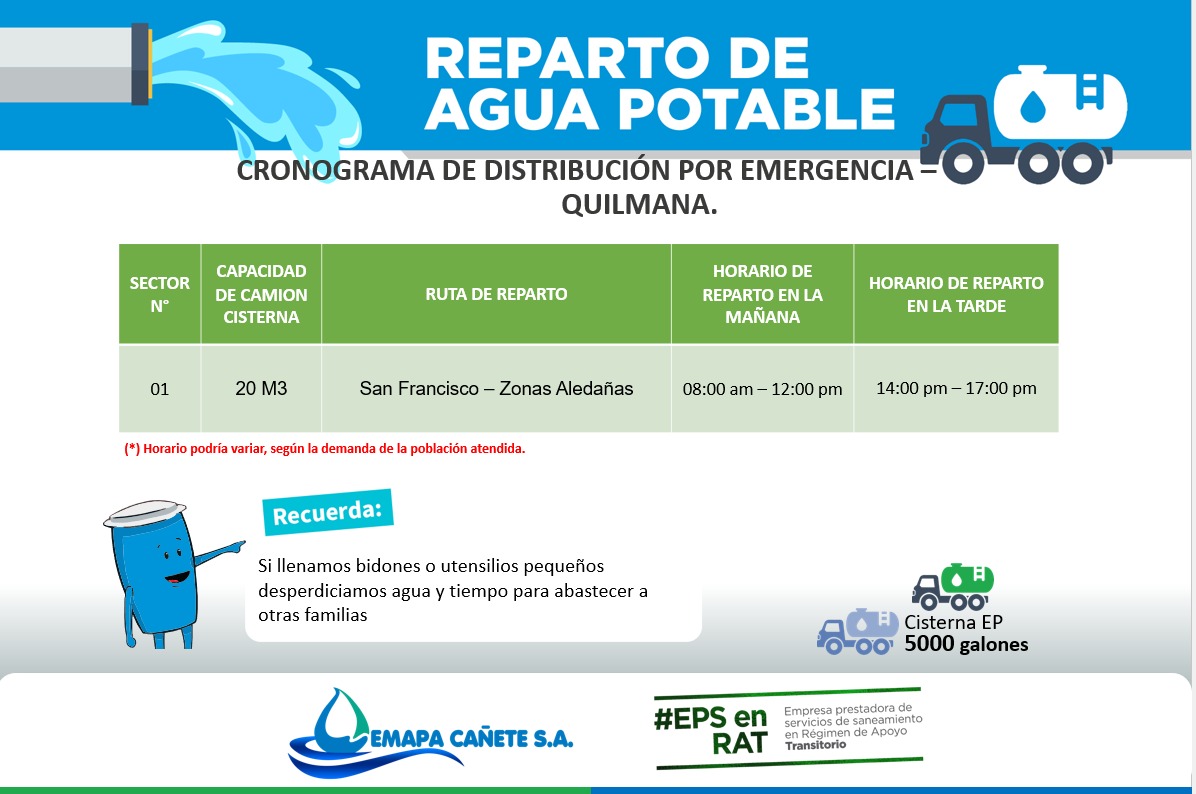 Se comunica a la población del sector San Francisco del distrito de Quilmana que, debido al agravamiento de la situación del abastecimiento del servicio de agua potable, la continuidad del servicio se ha visto seriamente afectada.