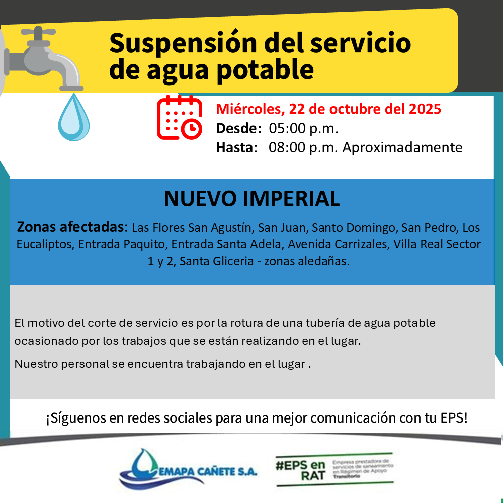 Informamos que, debido a la rotura de una tubería ocasionada por trabajos de la empresa Luz del Sur, suspenderemos el servicio de agua potable.