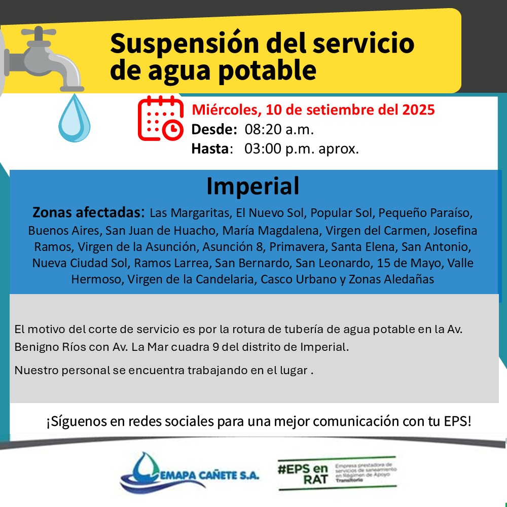 Informamos que, debido a la rotura de una tubería de agua potable en la Av. Benigno Ríos con Av. la Mar, cuadra 9, ocasionada durante la ejecución de una obra en el sector, nos vemos en la obligación de suspender el servicio en diversas zonas del distrito.