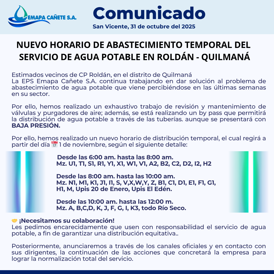NUEVO HORARIO DE ABASTECIMIENTO EN EL CP ROLDÁN QUILMANÁ
