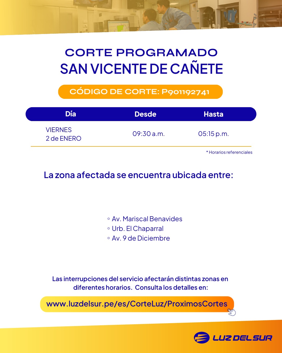 SUSPENSIÓN DEL SERVICIO DE AGUA POTABLE EN EL DISTRITO DE SAN VICENTE POR CORTE DE ENERGÍA ELÉCTRICA
