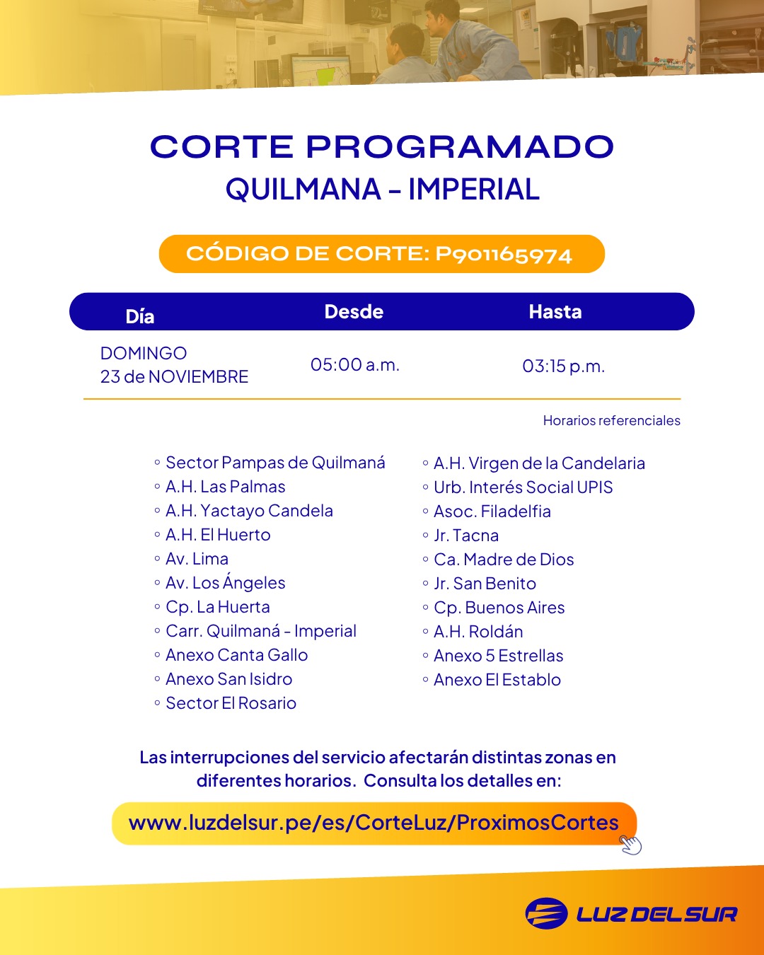 Suspensión del servicio de agua potable en el distrito de Quilmana por corte de energía eléctrica