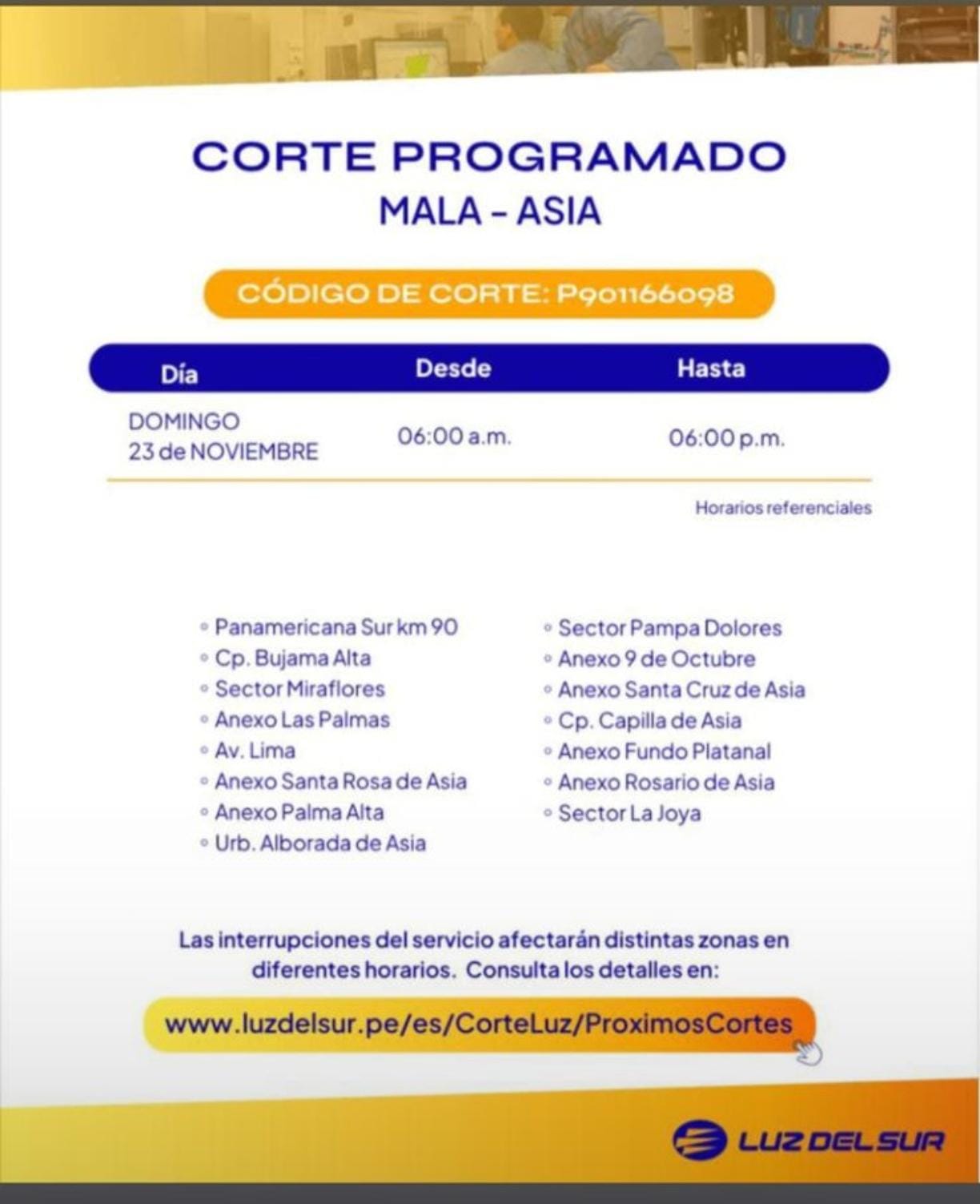 Suspensión del servicio de agua potable en el distrito de Asia por corte de energía eléctrica