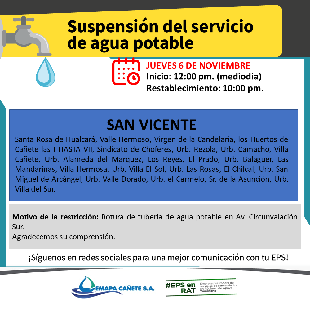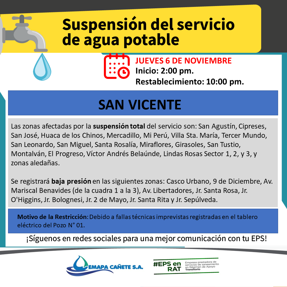 SUSPENSIÓN DEL SERVICIO DE AGUA POTABLE EN EL DISTRITO DE SAN VICENTE - ZONAS ABASTECIDAS POR EL POZO 1
