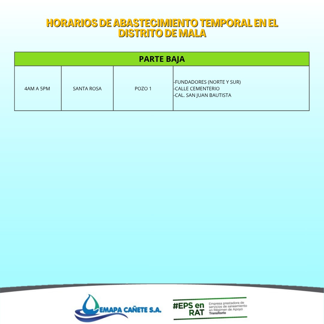 HORARIOS DE SECTORIZACIÓN TEMPORALPARA EL DISTRITO DE MALA DEL 8 DE NOVIEMBRE AL 30 DE DICIEMBRE