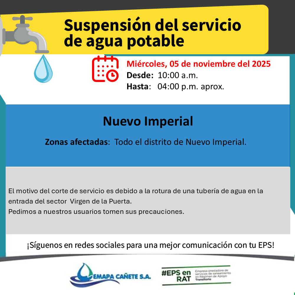 ⚠️ AVISO IMPORTANTE: Suspensión del Servicio de Agua Potable ⚠️ Estimados vecinos del distrito de Nuevo Imperial